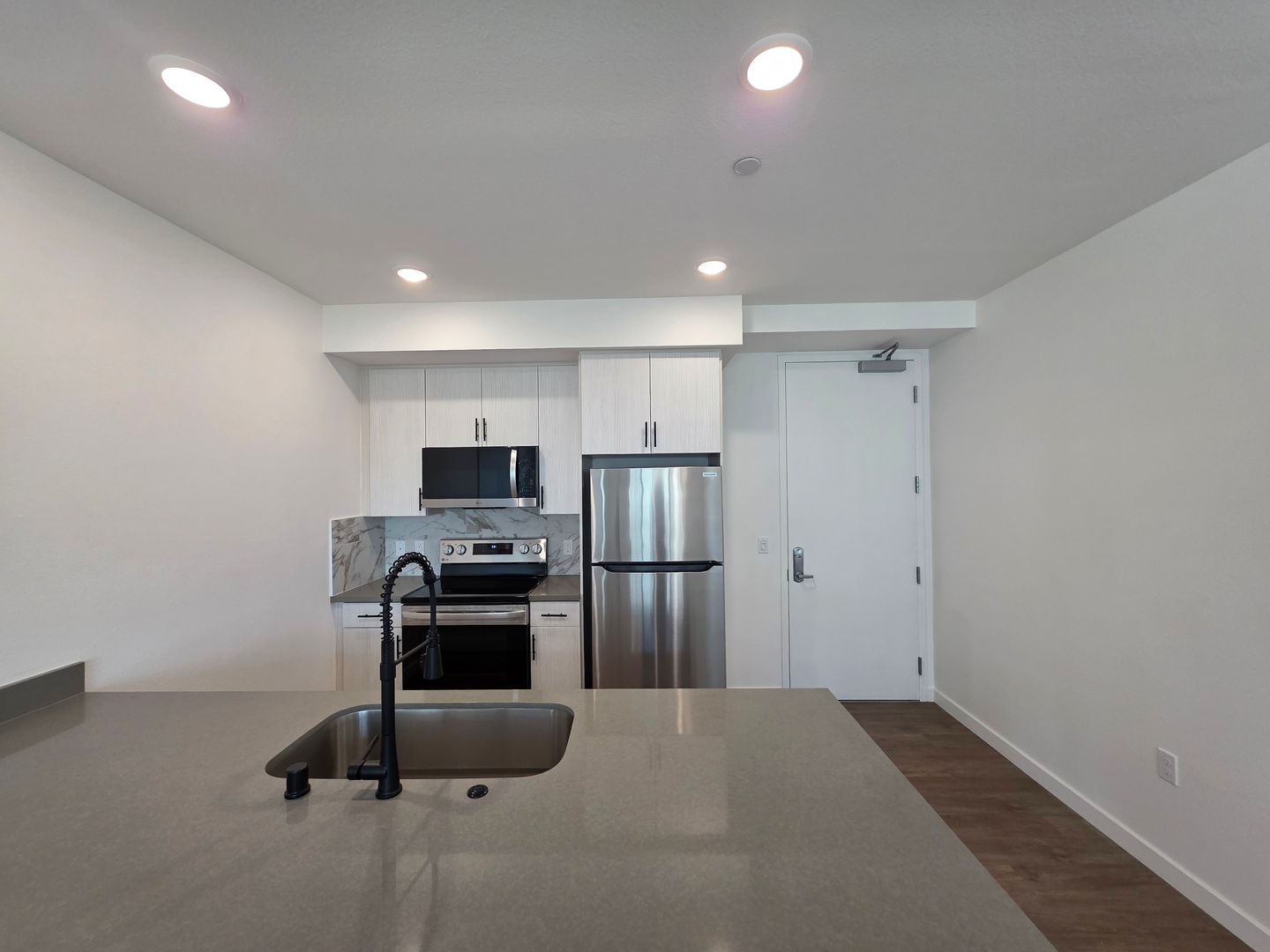 The kitchen is built for those who love to cook and stay organized, offering a large island with a deep sink and eight cabinets for significant storage capacity. High-end stainless steel appliances and quartz counter-tops complete the sleek, functional design.